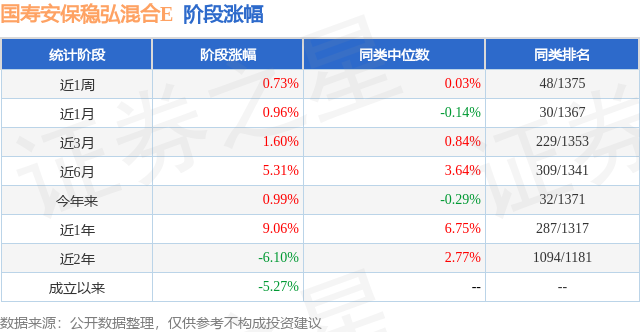 从业绩表现来看,国寿安保稳弘混合E基金过去一年净值涨幅为9.06%,在同类基金中排名287/1317,同类基金过去一年净值涨幅中位数为6.75%。而基金过去一年的最大回撤为-3.27%,成立以来的最大回撤为-21.21%。