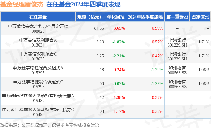 申万鑫享稳健混合发起式A现任基金经理为唐俊杰。其中在任基金经理唐俊杰已从业11年又332天,2023年7月10日正式接手管理申万鑫享稳健混合发起式A,任职期间累计回报为0.37%。目前还管理着7只基金产品(包括A类和C类),其中本季度表现最佳的基金为申万菱信安泰广利63个月定开债(008028),季度净值涨幅为0.99%。