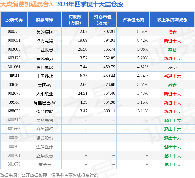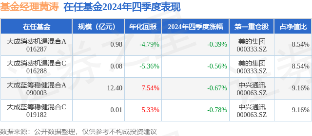 证券之星消息,日前大成消费机遇混合A基金公布四季报,2024年四季度最新规模0.98亿元,季度净值涨幅为-0.39%。