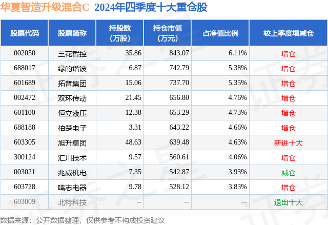 从基金规模来看,华夏智造升级混合C基金2024年四季度公布的基金规模为0.56亿元,较上一期规模2327.54万元变化了3228.81万元,环比变化了138.72%。该基金最新一期资产配置为:股票占净值比75.67%,无债券类资产,现金占净值比24.93%。从基金持仓来看,该基金当季前十大股票仓位达47.44%,第一大重仓股为三花智控(002050),持仓占比为6.11%。