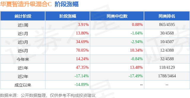 从业绩表现来看,华夏智造升级混合C基金过去一年净值涨幅为47.35%,在同类基金中排名118/4129,同类基金过去一年净值涨幅中位数为13.48%。而基金过去一年的最大回撤为-28.52%,成立以来的最大回撤为-55.73%。