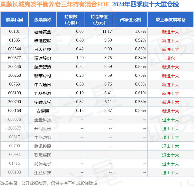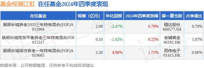 证券之星消息,日前景顺长城隽发平衡养老三年持有混合FOF基金公布四季报,2024年四季度最新规模0.1亿元,季度净值涨幅为0.23%。