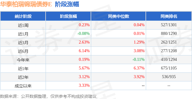 从业绩表现来看,华泰柏瑞锦瑞债券E基金过去一年净值涨幅为5.67%,在同类基金中排名675/1105,同类基金过去一年净值涨幅中位数为6.37%。而基金过去一年的最大回撤为-7.09%,成立以来的最大回撤为-9.66%。
