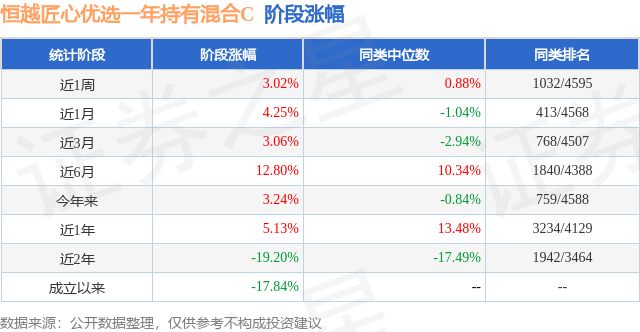 从业绩表现来看,恒越匠心优选一年持有混合C基金过去一年净值涨幅为5.13%,在同类基金中排名3234/4129,同类基金过去一年净值涨幅中位数为13.48%。而基金过去一年的最大回撤为-21.8%,成立以来的最大回撤为-33.86%。