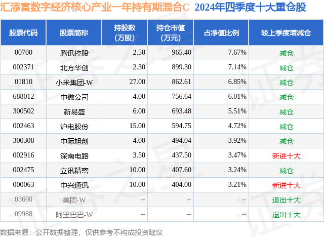 证券之星消息,日前汇添富数字经济核心产业一年持有期混合C基金公布四季报,2024年四季度最新规模0.05亿元,季度净值涨幅为2.38%。