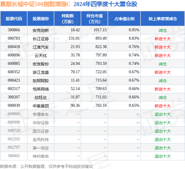 从基金规模来看,景顺长城中证500指数增强C基金2024年四季度公布的基金规模为1.61亿元,较上一期规模1732.72万元变化了1.43亿元,环比变化了827.72%。该基金最新一期资产配置为:股票占净值比92.96%,债券占净值比0.37%,现金占净值比6.74%。从基金持仓来看,该基金当季前十大股票仓位达7.33%,第一大重仓股为安克创新(300866),持仓占比为0.95%。