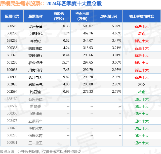 从基金规模来看,摩根民生需求股票C基金2024年四季度公布的基金规模为0.0亿元,较上一期规模10.73万元变化了6.59万元,环比变化了61.39%。该基金最新一期资产配置为:股票占净值比89.5%,债券占净值比0.06%,现金占净值比10.93%。从基金持仓来看,该基金当季前十大股票仓位达34.01%,第一大重仓股为贵州茅台(600519),持仓占比为5.07%。