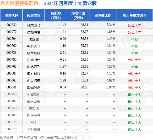 从基金规模来看,光大高端装备混合C基金2024年四季度公布的基金规模为0.09亿元,较上一期规模1132.49万元变化了-261.31万元,环比变化了-23.07%。该基金最新一期资产配置为:股票占净值比92.55%,无债券类资产,现金占净值比7.89%。从基金持仓来看,该基金当季前十大股票仓位达44.06%,第一大重仓股为科大讯飞(002230),持仓占比为5.34%。