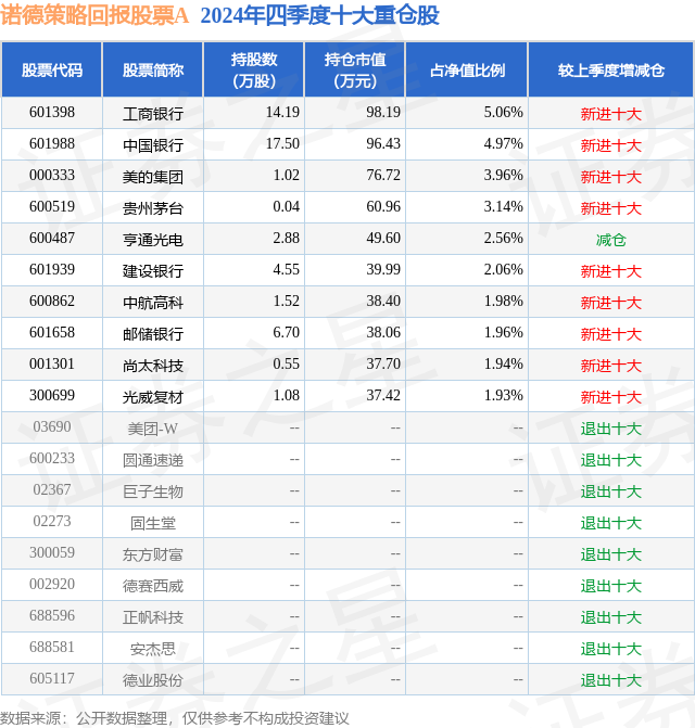 从基金规模来看,诺德策略回报股票A基金2024年四季度公布的基金规模为0.17亿元,较上一期规模1789.42万元变化了-56.83万元,环比变化了-3.18%。该基金最新一期资产配置为:股票占净值比82.74%,无债券类资产,现金占净值比13.26%。从基金持仓来看,该基金当季前十大股票仓位达29.56%,第一大重仓股为工商银行(601398),持仓占比为5.06%。