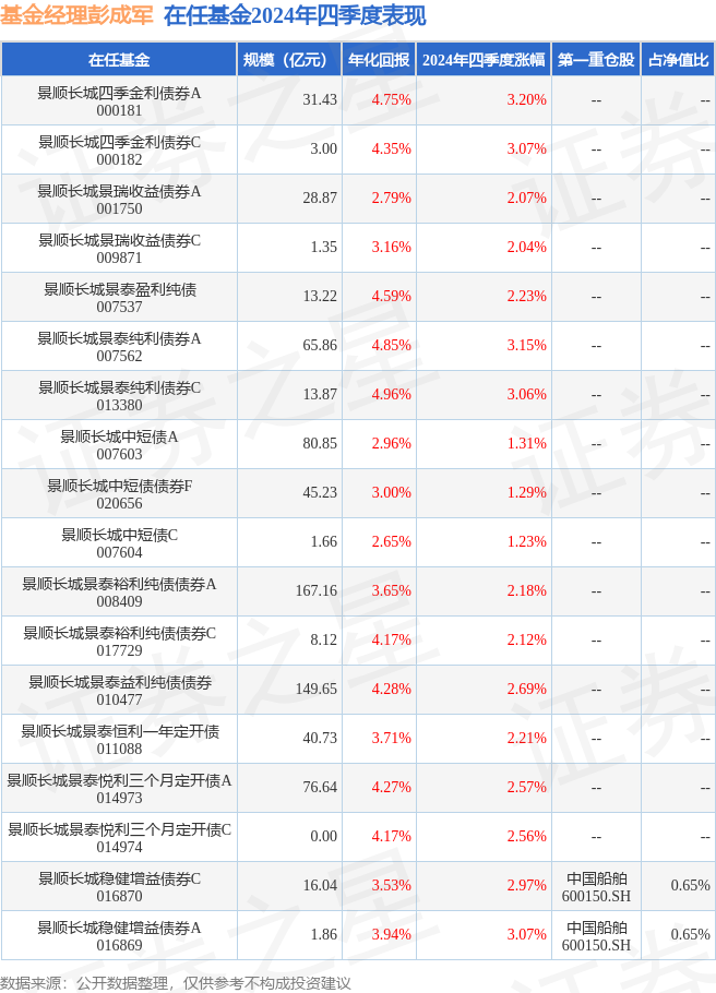 证券之星消息,日前景顺长城稳健增益债券A基金公布四季报,2024年四季度最新规模1.86亿元,季度净值涨幅为3.07%。