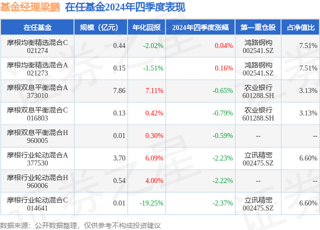证券之星消息,日前摩根双息平衡混合C基金公布四季报,2024年四季度最新规模0.13亿元,季度净值涨幅为-0.79%。