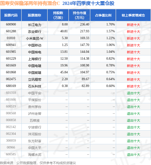证券之星消息,日前国寿安保稳泽两年持有混合C基金公布四季报,2024年四季度最新规模0.03亿元,季度净值涨幅为1.18%。
