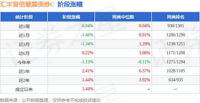 从业绩表现来看,汇丰晋信慧嘉债券C基金过去一年净值涨幅为2.41%,在同类基金中排名1028/1105,同类基金过去一年净值涨幅中位数为6.37%。而基金过去一年的最大回撤为-1.24%,成立以来的最大回撤为-1.84%。