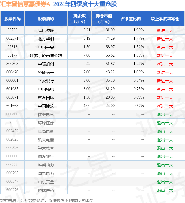 证券之星消息,日前汇丰晋信慧嘉债券A基金公布四季报,2024年四季度最新规模0.33亿元,季度净值涨幅为-0.43%。