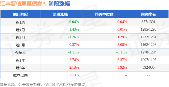 从业绩表现来看,汇丰晋信慧嘉债券A基金过去一年净值涨幅为2.74%,在同类基金中排名1007/1105,同类基金过去一年净值涨幅中位数为6.37%。而基金过去一年的最大回撤为-1.14%,成立以来的最大回撤为-1.62%。