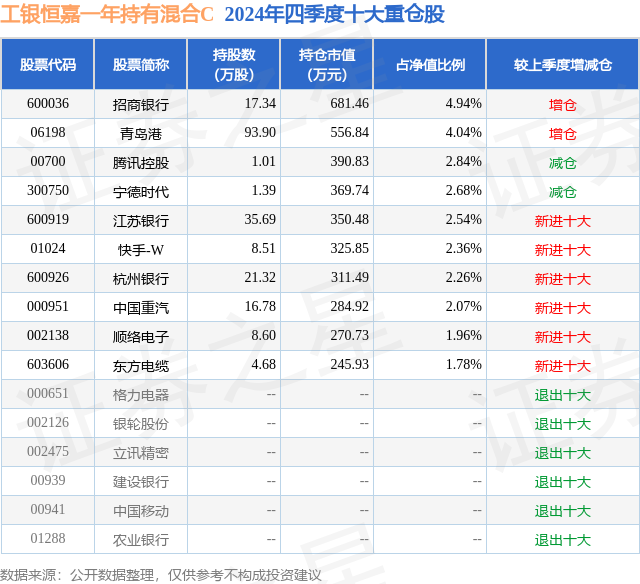 从基金规模来看,工银恒嘉一年持有混合C基金2024年四季度公布的基金规模为0.28亿元,较上一期规模3062.11万元变化了-272.06万元,环比变化了-8.88%。该基金最新一期资产配置为:股票占净值比94.78%,无债券类资产,现金占净值比7.04%。从基金持仓来看,该基金当季前十大股票仓位达27.47%,第一大重仓股为招商银行(600036),持仓占比为4.94%。