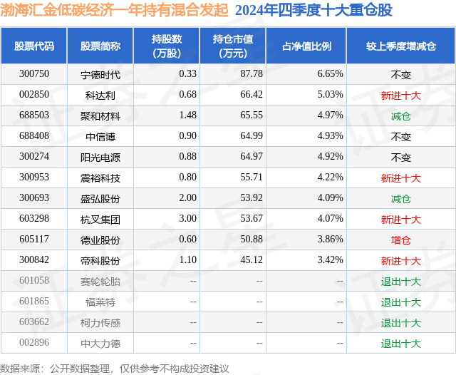 从基金规模来看,渤海汇金低碳经济一年持有混合发起基金2024年四季度公布的基金规模为0.13亿元,较上一期规模1403.2万元变化了-83.72万元,环比变化了-5.97%。该基金最新一期资产配置为:股票占净值比85.03%,无债券类资产,现金占净值比15.29%。从基金持仓来看,该基金当季前十大股票仓位达46.16%,第一大重仓股为宁德时代(300750),持仓占比为6.65%。