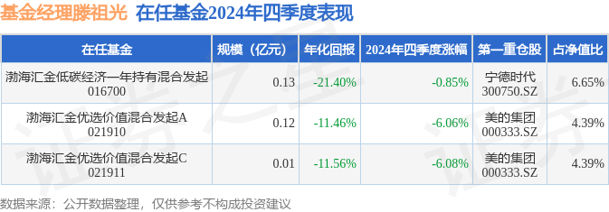渤海汇金低碳经济一年持有混合发起现任基金经理为滕祖光。其中在任基金经理滕祖光已从业9年又186天,2022年11月29日正式接手管理渤海汇金低碳经济一年持有混合发起,任职期间累计回报为-40.42%。目前还管理着3只基金产品(包括A类和C类)。