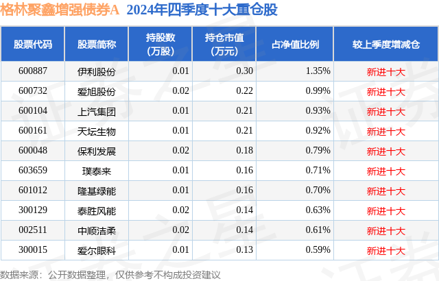 从基金规模来看,格林聚鑫增强债券A基金2024年四季度公布的基金规模为0.0亿元,较上一期规模12.93万元变化了-0.3万元,环比变化了-2.29%。该基金最新一期资产配置为:股票占净值比10.64%,无债券类资产,现金占净值比92.15%。从基金持仓来看,该基金当季前十大股票仓位达8.22%,第一大重仓股为伊利股份(600887),持仓占比为1.35%。