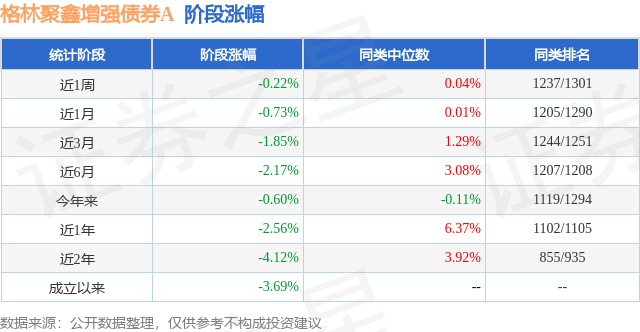 从业绩表现来看,格林聚鑫增强债券A基金过去一年净值涨幅为-2.56%,在同类基金中排名1102/1105,同类基金过去一年净值涨幅中位数为6.37%。而基金过去一年的最大回撤为-2.62%,成立以来的最大回撤为-4.57%。