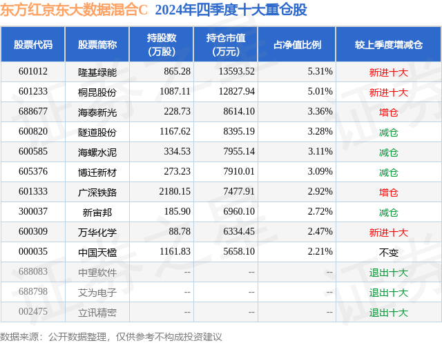 从基金规模来看,东方红京东大数据混合C基金2024年四季度公布的基金规模为8.37亿元,较上一期规模5.83亿元变化了2.55亿元,环比变化了43.69%。该基金最新一期资产配置为:股票占净值比77.27%,债券占净值比5.51%,现金占净值比17.71%。从基金持仓来看,该基金当季前十大股票仓位达33.48%,第一大重仓股为隆基绿能(601012),持仓占比为5.31%。