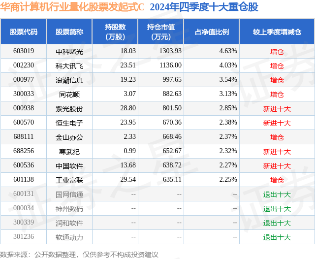 从基金规模来看,华商计算机行业量化股票发起式C基金2024年四季度公布的基金规模为0.86亿元,较上一期规模2803.53万元变化了5782.51万元,环比变化了206.26%。该基金最新一期资产配置为:股票占净值比92.55%,无债券类资产,现金占净值比7.41%。从基金持仓来看,该基金当季前十大股票仓位达29.77%,第一大重仓股为中科曙光(603019),持仓占比为4.63%。