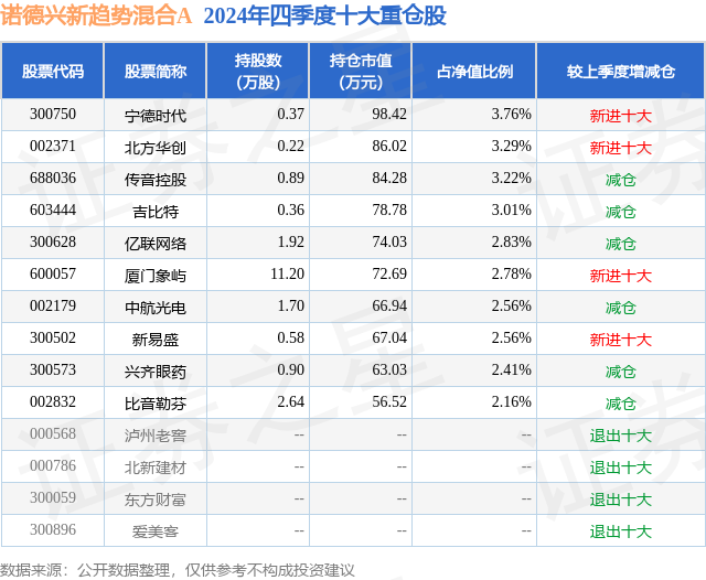 从基金规模来看,诺德兴新趋势混合A基金2024年四季度公布的基金规模为0.19亿元,较上一期规模2454.38万元变化了-523.93万元,环比变化了-21.35%。该基金最新一期资产配置为:股票占净值比93.53%,债券占净值比5.4%,现金占净值比1.43%。从基金持仓来看,该基金当季前十大股票仓位达28.58%,第一大重仓股为宁德时代(300750),持仓占比为3.76%。