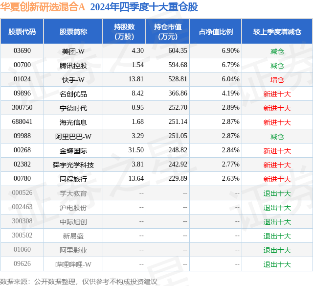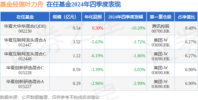 从基金规模来看,华夏创新研选混合A基金2024年四季度公布的基金规模为0.29亿元,较上一期规模3008.26万元变化了-101.76万元,环比变化了-3.38%。该基金最新一期资产配置为:股票占净值比89.45%,无债券类资产,现金占净值比11.04%。从基金持仓来看,该基金当季前十大股票仓位达40.79%,第一大重仓股为美团-W(03690),持仓占比为6.9%。