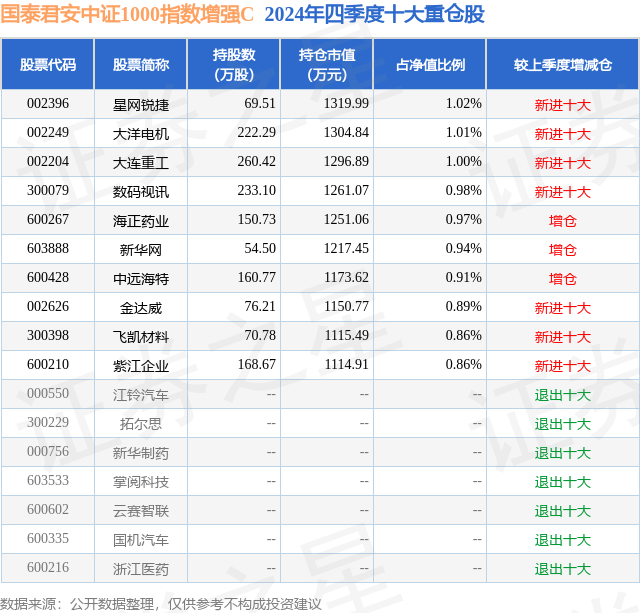从基金规模来看,国泰君安中证1000指数增强C基金2024年四季度公布的基金规模为6.25亿元,较上一期规模3.39亿元变化了2.86亿元,环比变化了84.26%。该基金最新一期资产配置为:股票占净值比92.77%,无债券类资产,现金占净值比7.02%。从基金持仓来看,该基金当季前十大股票仓位达9.44%,第一大重仓股为星网锐捷(002396),持仓占比为1.02%。