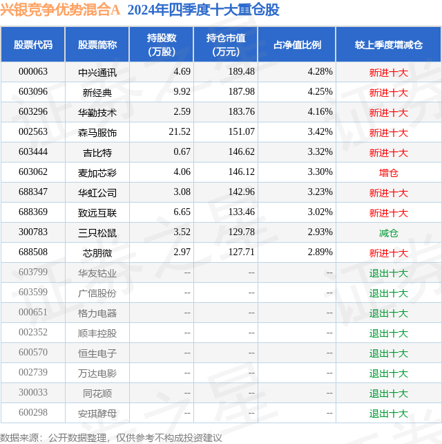 从基金规模来看,兴银竞争优势混合A基金2024年四季度公布的基金规模为0.29亿元,较上一期规模2971.01万元变化了-104.0万元,环比变化了-3.5%。该基金最新一期资产配置为:股票占净值比91.65%,无债券类资产,现金占净值比9.18%。从基金持仓来看,该基金当季前十大股票仓位达34.8%,第一大重仓股为中兴通讯(000063),持仓占比为4.28%。