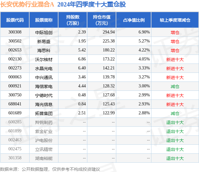 从基金规模来看,长安优势行业混合A基金2024年四季度公布的基金规模为0.41亿元,较上一期规模4655.09万元变化了-535.57万元,环比变化了-11.5%。该基金最新一期资产配置为:股票占净值比79.12%,无债券类资产,现金占净值比17.22%。从基金持仓来看,该基金当季前十大股票仓位达38.84%,第一大重仓股为中际旭创(300308),持仓占比为6.9%。