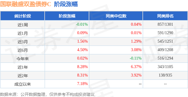 从业绩表现来看,国联融盛双盈债券C基金过去一年净值涨幅为8.28%,在同类基金中排名343/1105,同类基金过去一年净值涨幅中位数为6.37%。而基金过去一年的最大回撤为-1.73%,成立以来的最大回撤为-2.41%。