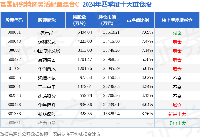 从基金规模来看,富国研究精选灵活配置混合C基金2024年四季度公布的基金规模为17.84亿元,较上一期规模21.24亿元变化了-3.41亿元,环比变化了-16.04%。该基金最新一期资产配置为:股票占净值比92.84%,无债券类资产,现金占净值比7.7%。从基金持仓来看,该基金当季前十大股票仓位达53.28%,第一大重仓股为农产品(000061),持仓占比为7.69%。