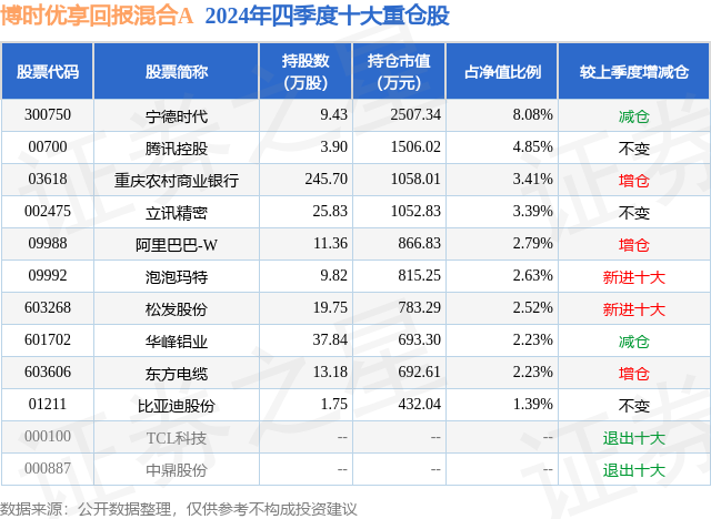 从基金规模来看,博时优享回报混合A基金2024年四季度公布的基金规模为2.93亿元,较上一期规模2.96亿元变化了-292.85万元,环比变化了-0.99%。该基金最新一期资产配置为:股票占净值比79.83%,债券占净值比1.03%,现金占净值比18.88%。从基金持仓来看,该基金当季前十大股票仓位达33.52%,第一大重仓股为宁德时代(300750),持仓占比为8.08%。
