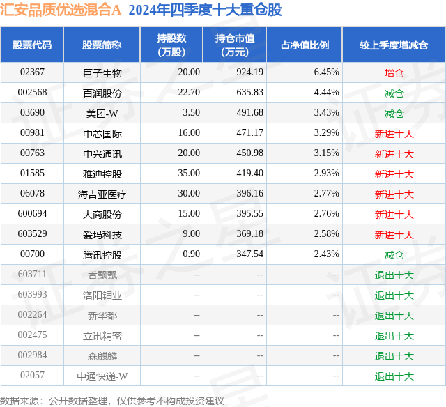 从基金规模来看,汇安品质优选混合A基金2024年四季度公布的基金规模为1.23亿元,较上一期规模1.15亿元变化了823.65万元,环比变化了7.18%。该基金最新一期资产配置为:股票占净值比93.46%,无债券类资产,现金占净值比7.92%。从基金持仓来看,该基金当季前十大股票仓位达34.23%,第一大重仓股为巨子生物(02367),持仓占比为6.45%。