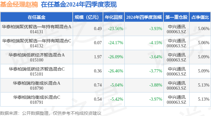证券之星消息,日前华泰柏瑞低碳经济智选混合A基金公布四季报,2024年四季度最新规模1.97亿元,季度净值涨幅为-3.64%。