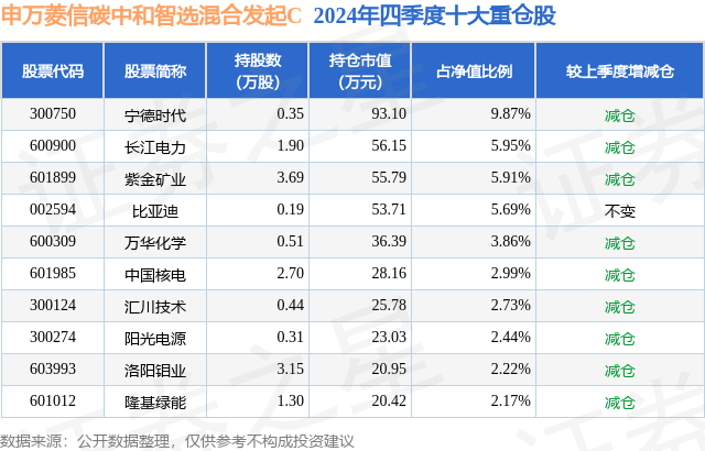 证券之星消息,日前申万菱信碳中和智选混合发起C基金公布四季报,2024年四季度最新规模0.02亿元,季度净值涨幅为-7.06%。