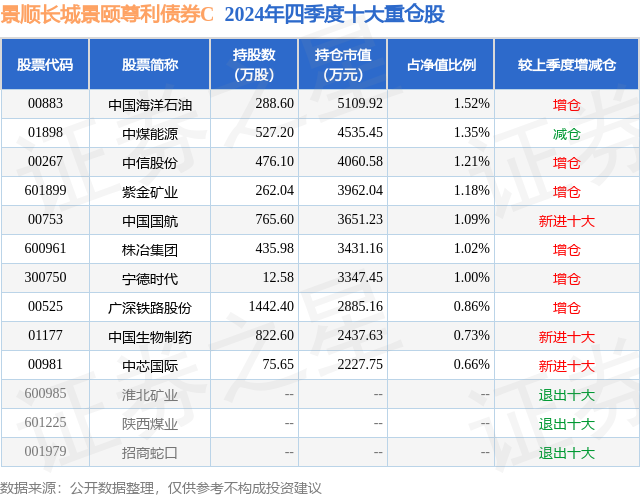 从基金规模来看,景顺长城景颐尊利债券C基金2024年四季度公布的基金规模为6.19亿元,较上一期规模7.16亿元变化了-9693.12万元,环比变化了-13.55%。该基金最新一期资产配置为:股票占净值比19.38%,债券占净值比89.15%,现金占净值比0.63%。从基金持仓来看,该基金当季前十大股票仓位达10.62%,第一大重仓股为中国海洋石油(00883),持仓占比为1.52%。