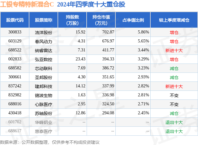 证券之星消息,日前工银专精特新混合C基金公布四季报,2024年四季度最新规模0.08亿元,季度净值涨幅为4.07%。