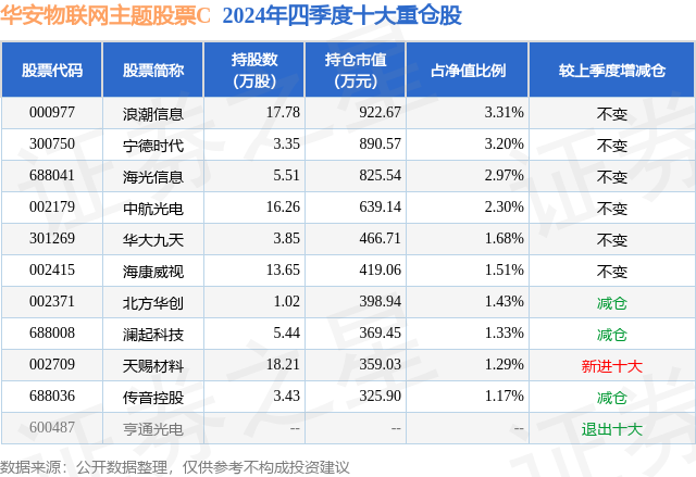 从基金规模来看,华安物联网主题股票C基金2024年四季度公布的基金规模为0.08亿元,较上一期规模67.03万元变化了780.47万元,环比变化了1164.38%。该基金最新一期资产配置为:股票占净值比93.79%,债券占净值比0.23%,现金占净值比6.2%。从基金持仓来看,该基金当季前十大股票仓位达20.19%,第一大重仓股为浪潮信息(000977),持仓占比为3.31%。