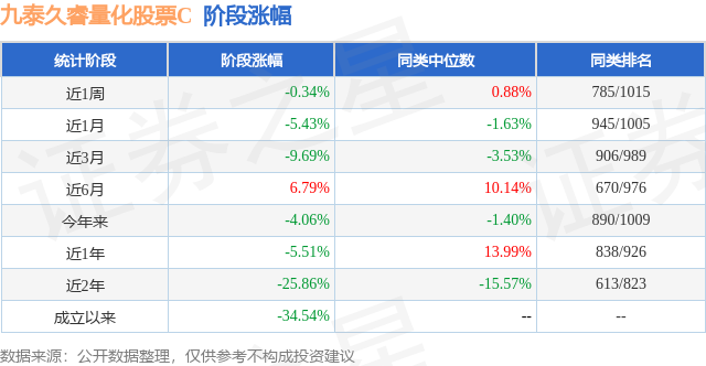 从业绩表现来看,九泰久睿量化股票C基金过去一年净值涨幅为-5.51%,在同类基金中排名838/926,同类基金过去一年净值涨幅中位数为13.99%。而基金过去一年的最大回撤为-23.81%,成立以来的最大回撤为-46.41%。