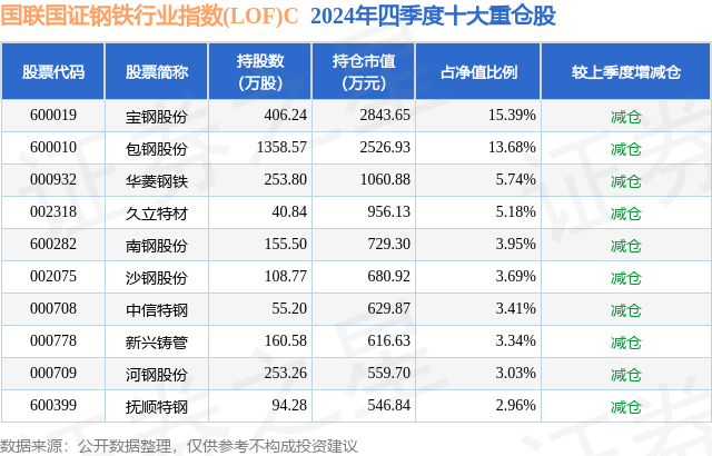证券之星消息,日前国联国证钢铁行业指数(LOF)C基金公布四季报,2024年四季度最新规模0.08亿元,季度净值涨幅为-1.66%。