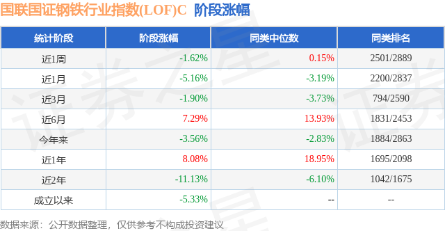 从业绩表现来看,国联国证钢铁行业指数(LOF)C基金过去一年净值涨幅为8.08%,在同类基金中排名1695/2098,同类基金过去一年净值涨幅中位数为18.95%。而基金过去一年的最大回撤为-22.39%,成立以来的最大回撤为-29.55%。