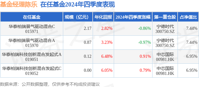 从基金规模来看,华泰柏瑞景气驱动混合A基金2024年四季度公布的基金规模为0.87亿元,较上一期规模7013.9万元变化了1656.41万元,环比变化了23.62%。该基金最新一期资产配置为:股票占净值比86.23%,无债券类资产,现金占净值比13.75%。从基金持仓来看,该基金当季前十大股票仓位达38.6%,第一大重仓股为宁德时代(300750),持仓占比为7.44%。