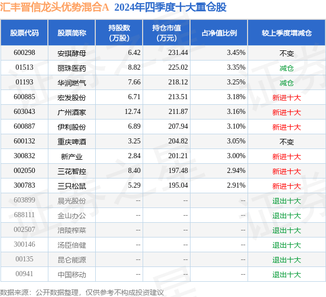 证券之星消息,日前汇丰晋信龙头优势混合A基金公布四季报,2024年四季度最新规模0.57亿元,季度净值涨幅为-2.18%。