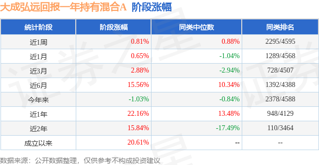 从业绩表现来看,大成弘远回报一年持有混合A基金过去一年净值涨幅为22.16%,在同类基金中排名948/4129,同类基金过去一年净值涨幅中位数为13.48%。而基金过去一年的最大回撤为-8.05%,成立以来的最大回撤为-17.3%。