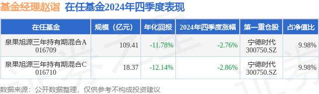 证券之星消息,日前泉果旭源三年持有期混合C基金公布四季报,2024年四季度最新规模18.37亿元,季度净值涨幅为-2.86%。