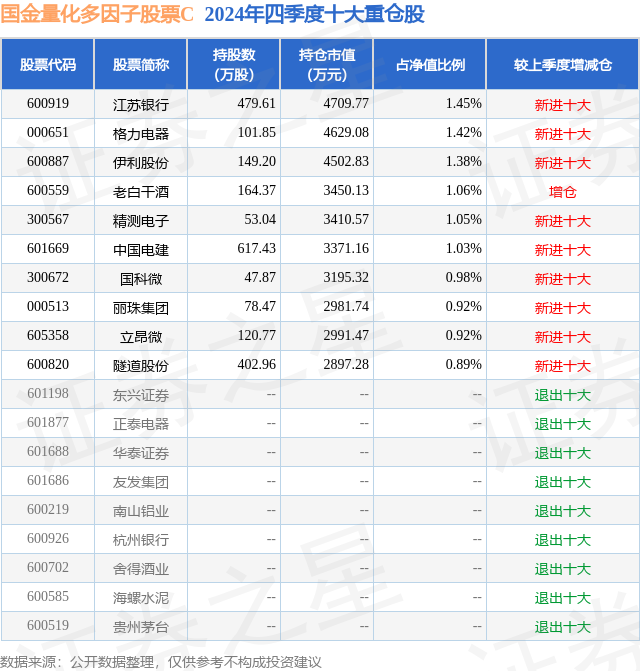 从基金规模来看,国金量化多因子股票C基金2024年四季度公布的基金规模为8.71亿元,较上一期规模11.14亿元变化了-2.42亿元,环比变化了-21.77%。该基金最新一期资产配置为:股票占净值比89.03%,无债券类资产,现金占净值比6.69%。从基金持仓来看,该基金当季前十大股票仓位达11.1%,第一大重仓股为江苏银行(600919),持仓占比为1.45%。