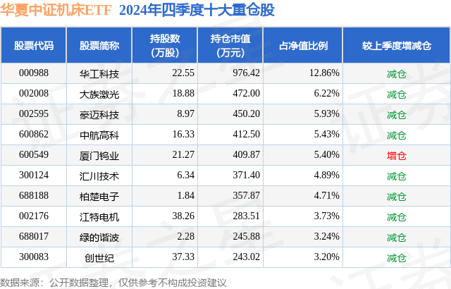 从基金规模来看,华夏中证机床ETF基金2024年四季度公布的基金规模为0.76亿元,较上一期规模8592.0万元变化了-1000.35万元,环比变化了-11.64%。该基金最新一期资产配置为:股票占净值比99.72%,无债券类资产,现金占净值比0.58%。从基金持仓来看,该基金当季前十大股票仓位达55.61%,第一大重仓股为华工科技(000988),持仓占比为12.86%。