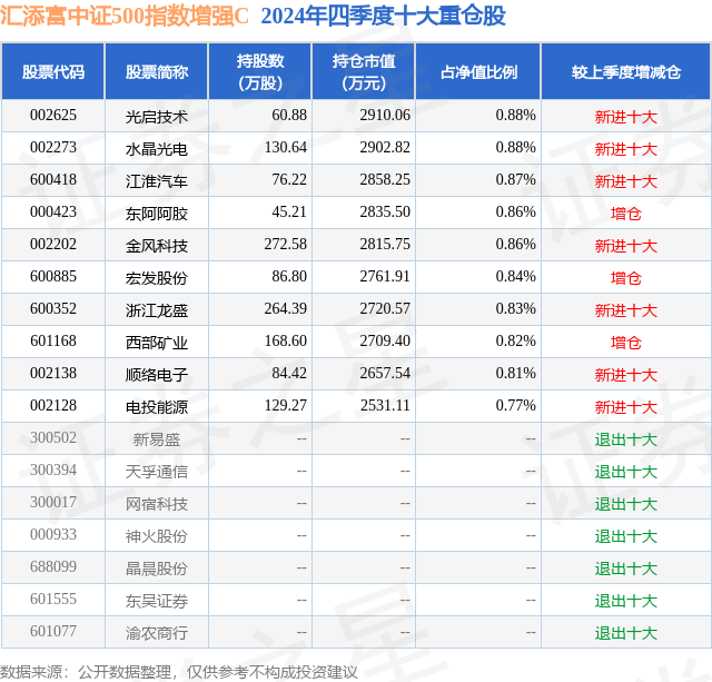 从基金规模来看,汇添富中证500指数增强C基金2024年四季度公布的基金规模为10.12亿元,较上一期规模6.26亿元变化了3.86亿元,环比变化了61.74%。该基金最新一期资产配置为:股票占净值比93.86%,债券占净值比0.08%,现金占净值比6.57%。从基金持仓来看,该基金当季前十大股票仓位达8.42%,第一大重仓股为光启技术(002625),持仓占比为0.88%。
